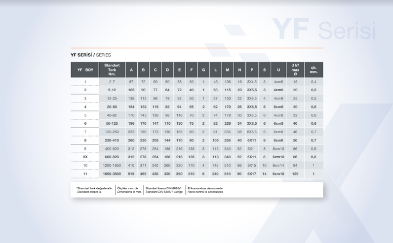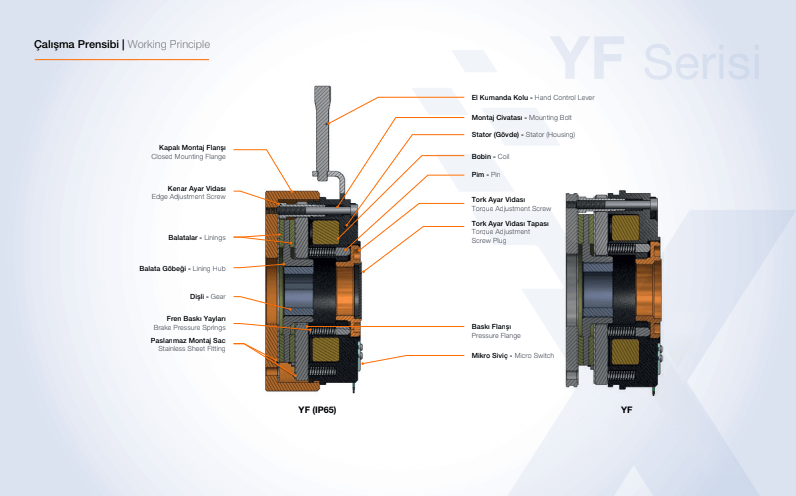 Modüler yapıda tasarlanmış YF frenlerimiz; hareket halindeki yüklerin kontrollü duruş, kalkış veya kontrolsüz kalması sonucu tehlike yaratabilecek pozisyona gelmeden emniyetli duruşu sağlayan frenlerdir. Kullanım alanına göre seçim yapılabilmesi için frenlerin modülleri yardımıyla en uygun montajı, stator gövdesini değiştirmeden hızlı ve güvenli şekilde yapabilmek mümkündür. Özel uygulamalar için yüksek tork frenler 5000 Nm. kadar üretilebilmektedir.